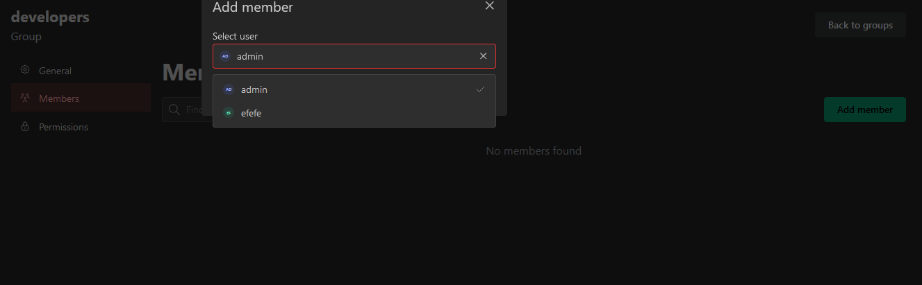 In this tab, you can assign users to the group. With the button at the top right, a new member can be added to the group: