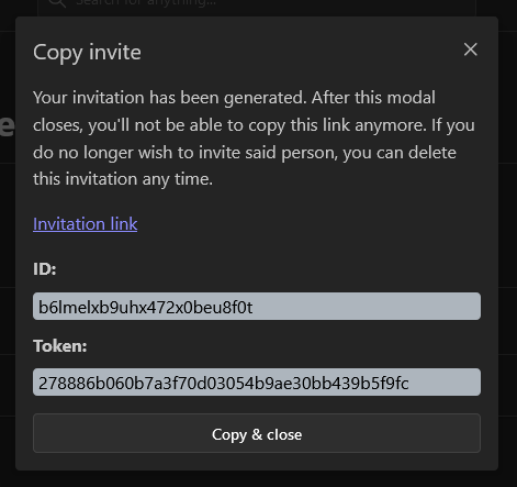 Both ID and Token are also in the URL. Ensure that you copy either ID & Token or the URL - it will never be shown again. Clicking the Copy & close button will copy the URL to your clipboard.
