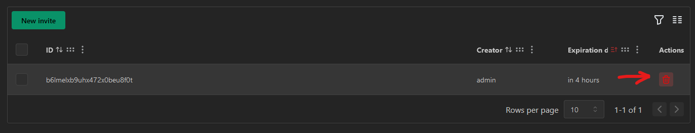 If an invitation needs to be deleted before or after the expiry, the delete button at the end of the table can be used: