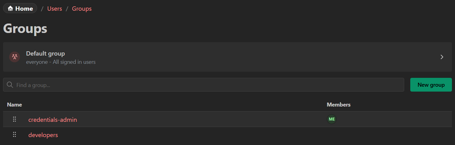 By default, a group called "credentials-admin" will be generated where the first user will be placed. However, you can create as many groups as you'd like.