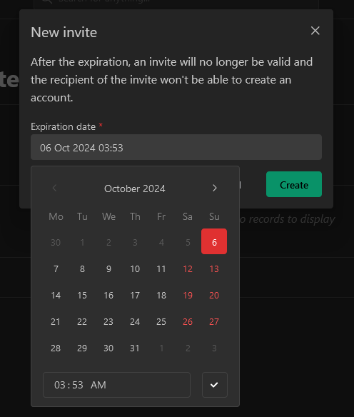 Next, define the expiration time for this invitation. They will expire after some time and will no longer be valid. It must be at least 1 hour in the future and at max 6 months in the future. The default is 4 hours in the future.