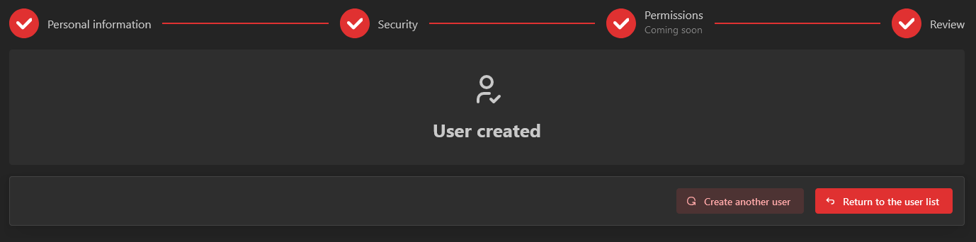 After you completed all steps, you can start over to create another user or choose to go back to the list: